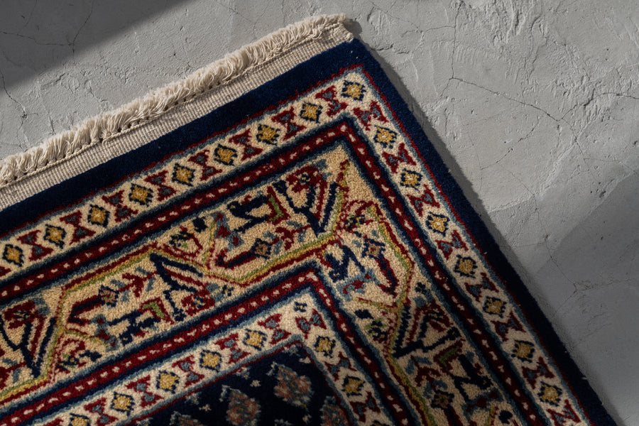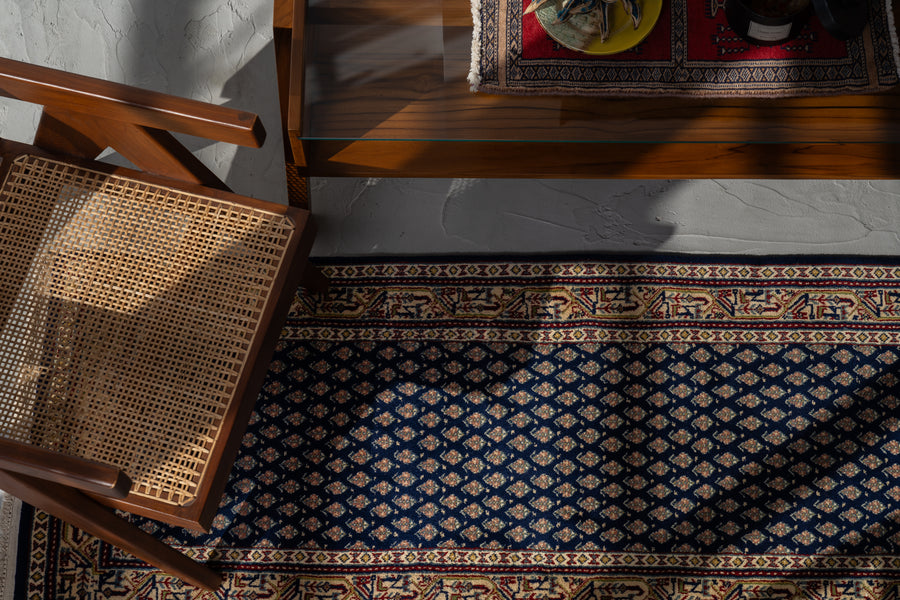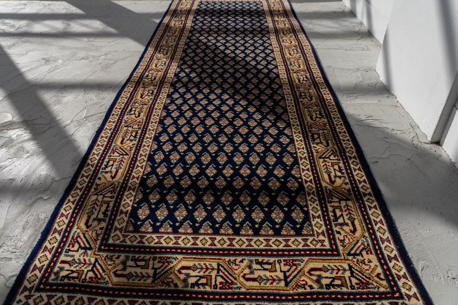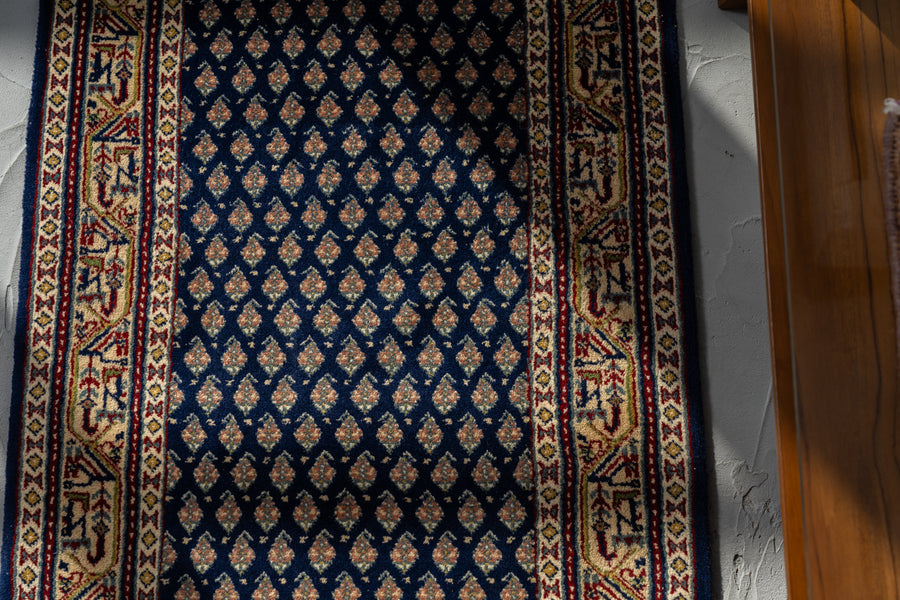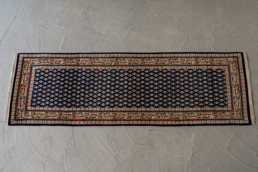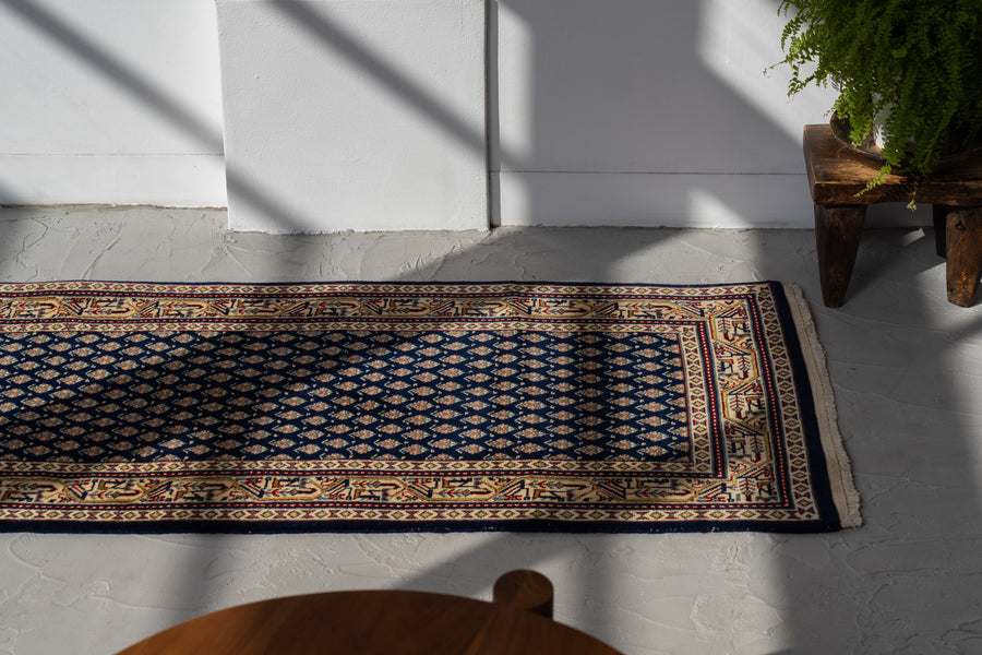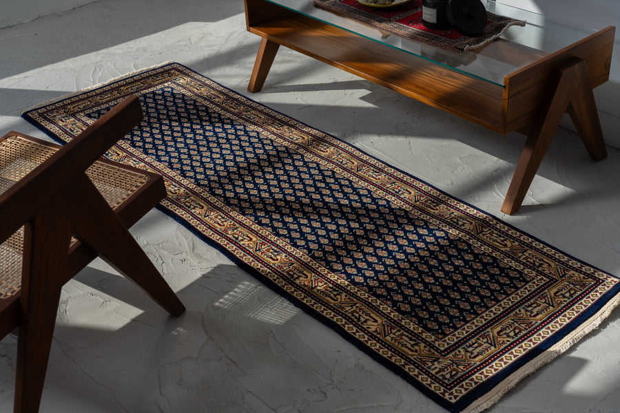 インド産 1990年代 ヴィンテージラグ ランナー 細長い ボテ柄 子孫繁栄 縁起物 ネイビー 紺 6畳 8畳 10畳 リビング 廊下 ソファ 椅子 ワークデスク ジャンヌレ PierreJeanneret 家具 ビンテージ カーペット 手織り絨毯 ヴィンテージラグ専門店 amaleh 通販