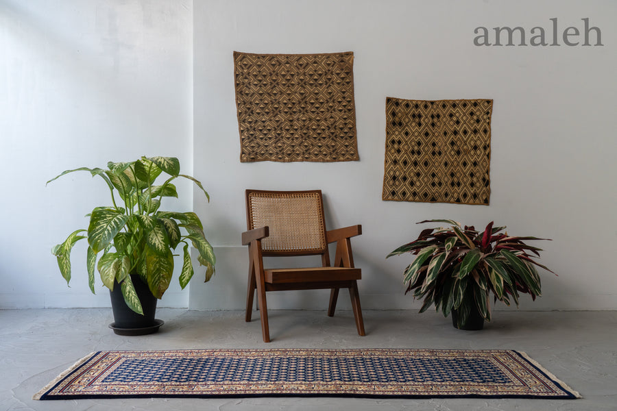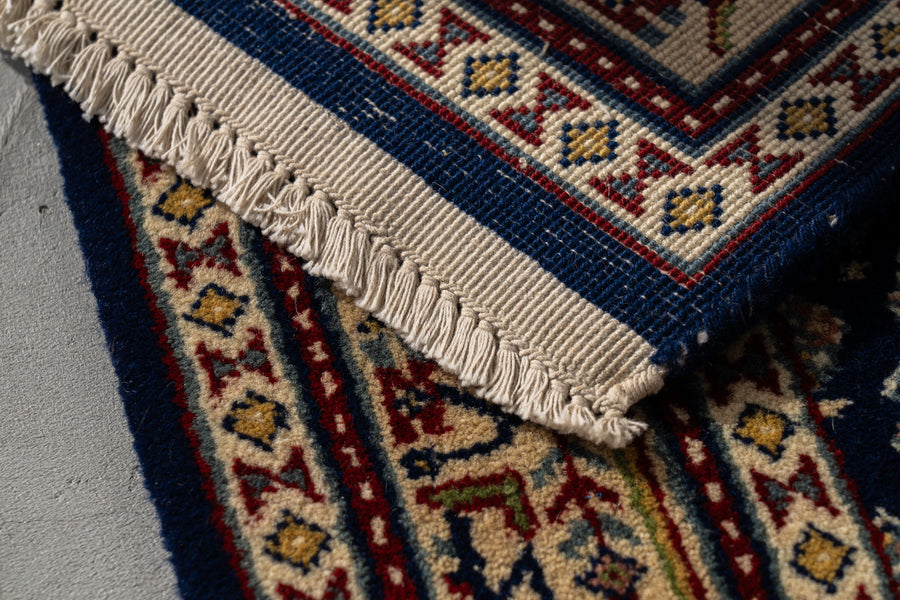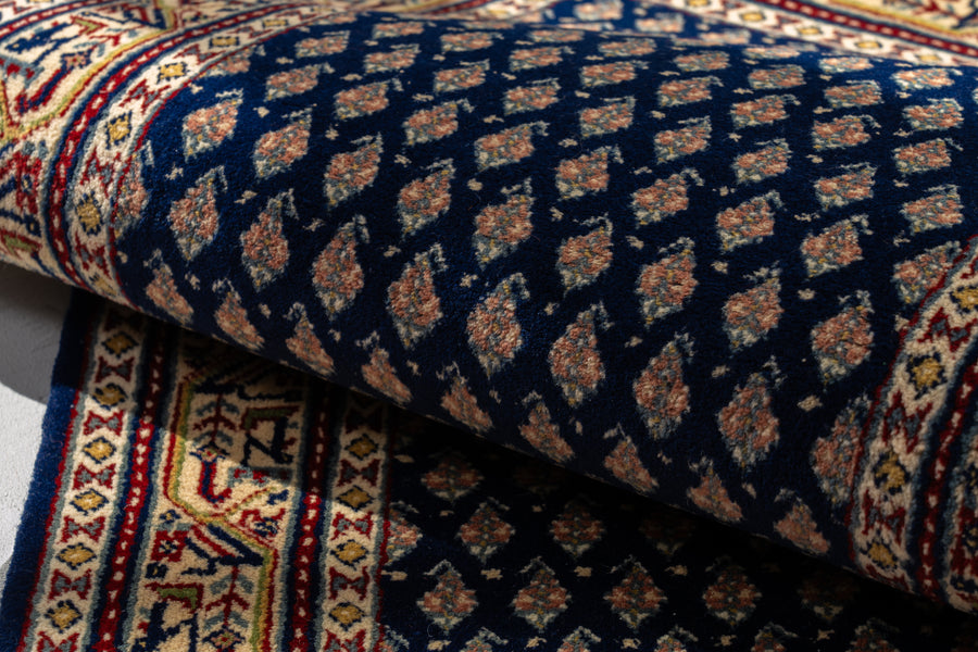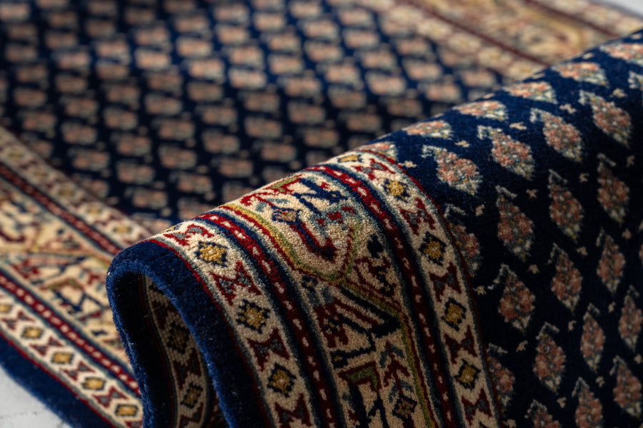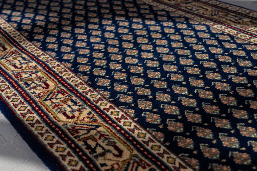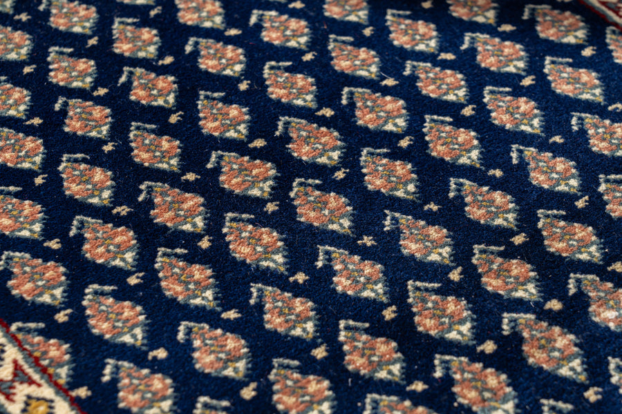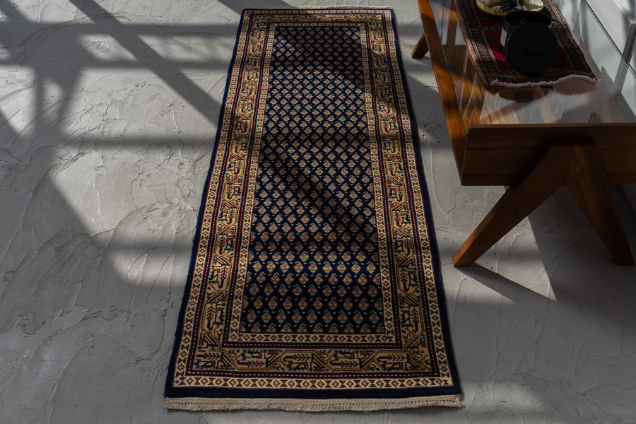 インド産 1990年代 ヴィンテージラグ ランナー 細長い ボテ柄 子孫繁栄 縁起物 ネイビー 紺 6畳 8畳 10畳 リビング 廊下 ソファ 椅子 ワークデスク ジャンヌレ PierreJeanneret 家具 ビンテージ カーペット 手織り絨毯 ヴィンテージラグ専門店 amaleh 通販
