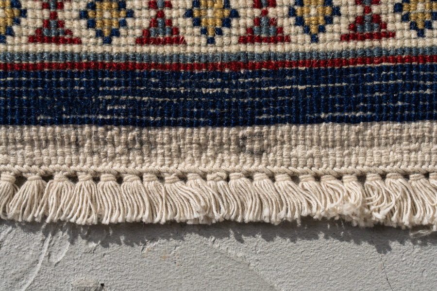 織りはウールよりも強度が高いコットンの経糸に、二重にしてウールを織り込むダブルノット織りの技法で織られているので丈夫で重量があります。
