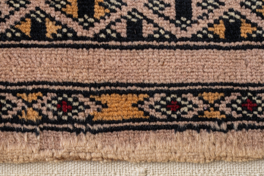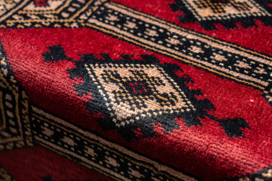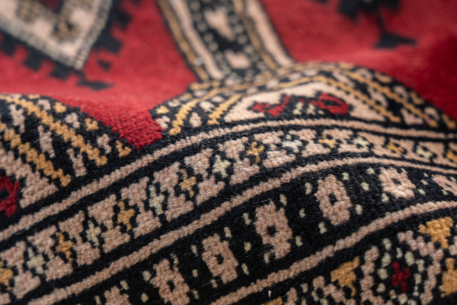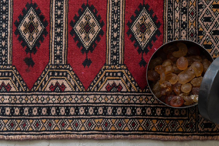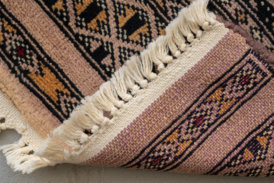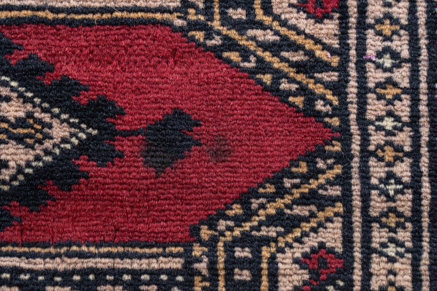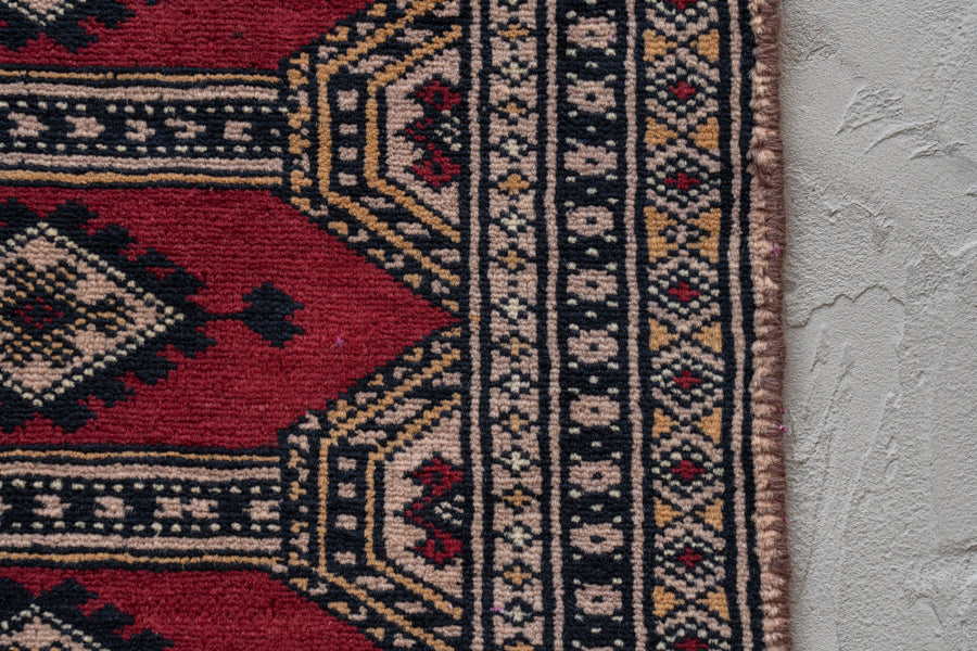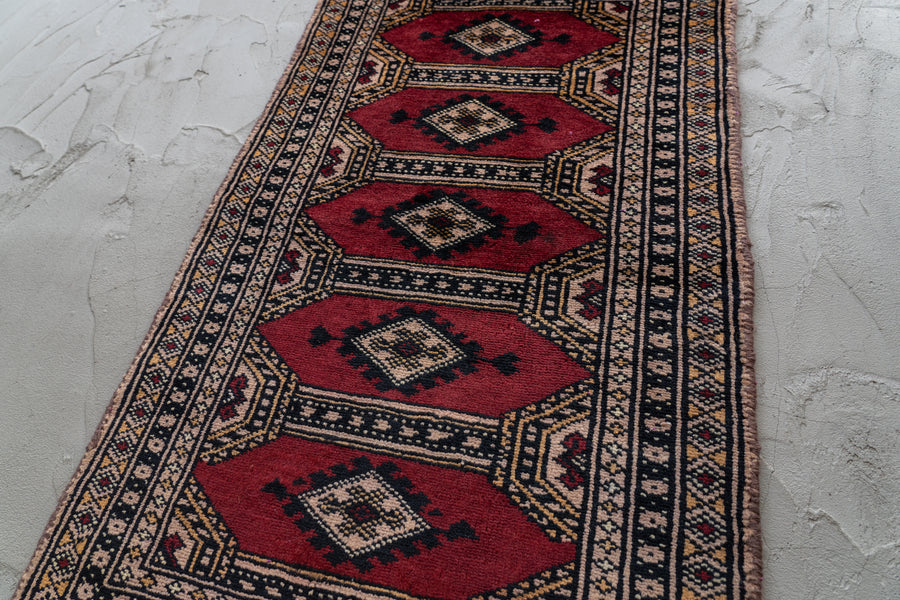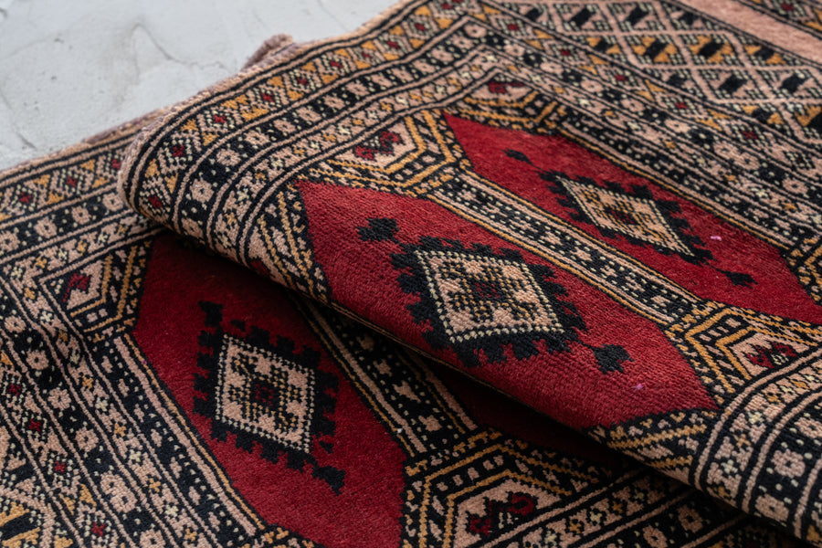 デザインはパキスタンラグらしいメダリオンが並んで織られた左右均等な見た目のデザイン。