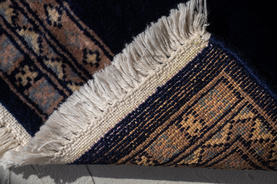 毛足は綺麗に残っていて厚みはヴィンテージのパキスタンラグの中ではやや厚手の9㎜程ございます。