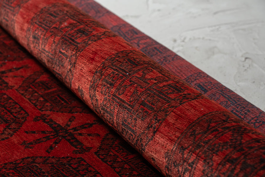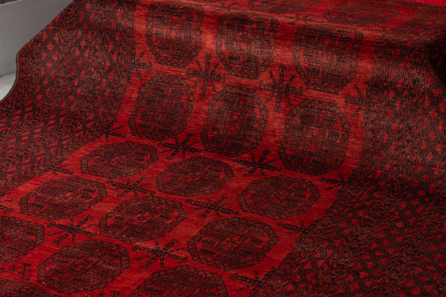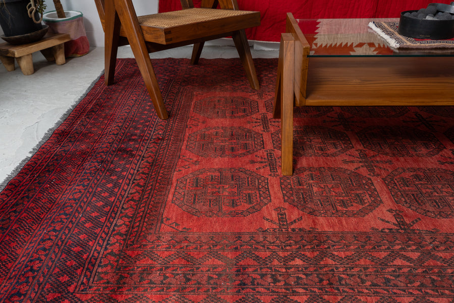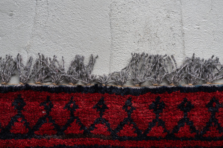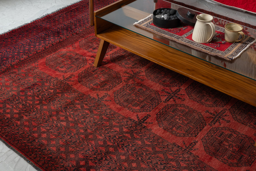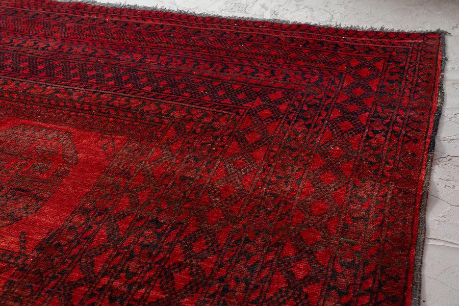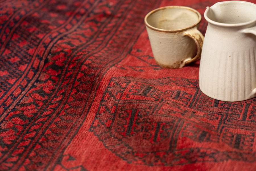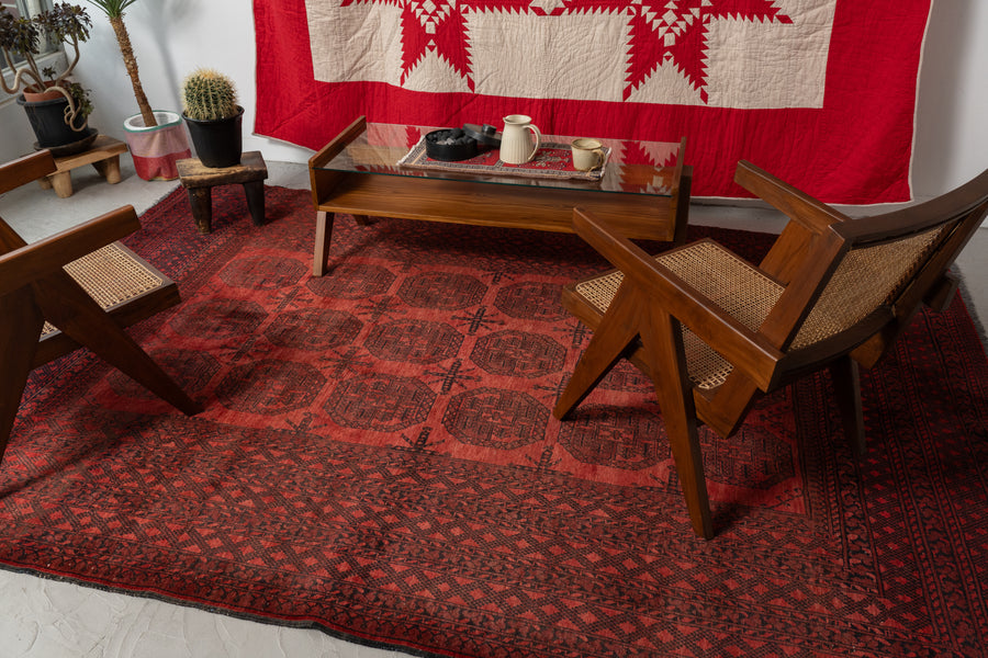 このラグを織ったトルクメン族は自分達が着ている民族衣装から住まいのテントまで赤を基調としたものを使用していて、赤い絨毯といえばトルクメンラグが真っ先に出てくる程世界的にも赤いラグで有名な民族です。