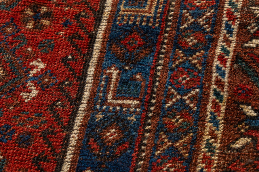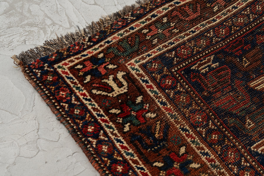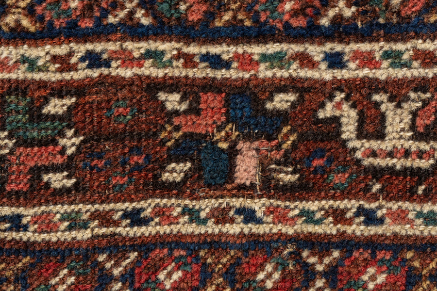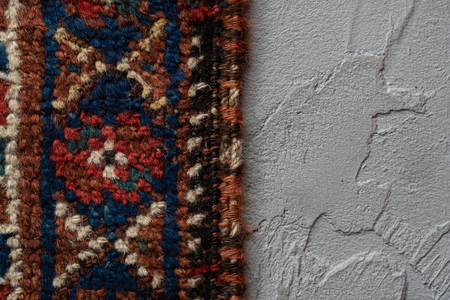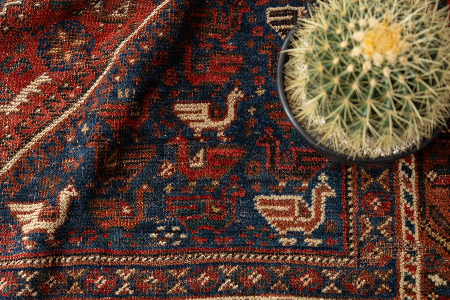 遊牧生活をしながらラグを織るカシュガイ族は自然界で見るお花や鳥などをアイコンのような柄にしてラグに織ることが多いんですがこちらのラグにもその特徴がよく見られますね。